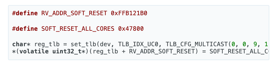 In order to start from a clean slate, we'll want to use a NoC multicast write to put all cores into soft-reset, specifying (0, 0) through (9, 11) inclusive as the multicast rectangle, and relying on the multicast disable row/column we saw in part 2 to ensure that the multicast only goes to T tiles: