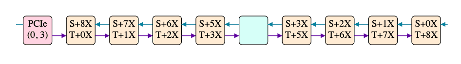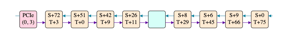 Going rightwards, the first tile is "T+3" and the last is "T+75", meaning 72 cycles to traverse 8 tiles. Going leftwards, the first tile is "S+0" and the last is "S+72", again meaning 72 cycles to traverse 8 tiles. However, going rightwards, the 2nd tile is "T+0", which isn't great: taken at face value it would mean that the multicast reached the 2nd tile before reaching the first, which is clearly nonsense. There is one obvious explanation for this: the cycle counters on different tiles aren't perfectly aligned - they're meant to all start from 0 when the chip powers on, but powering on is a physically complex process, so some tiles might start counting a few cycles before or after others.